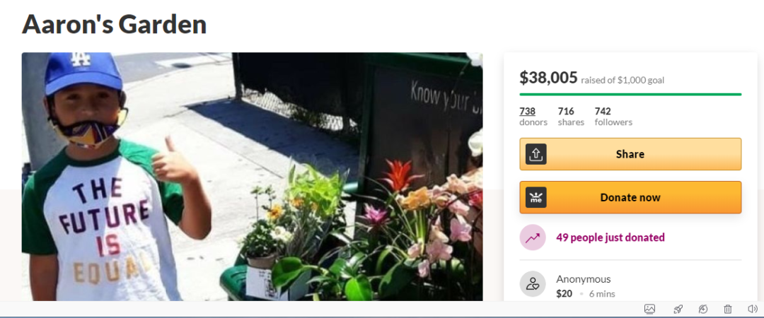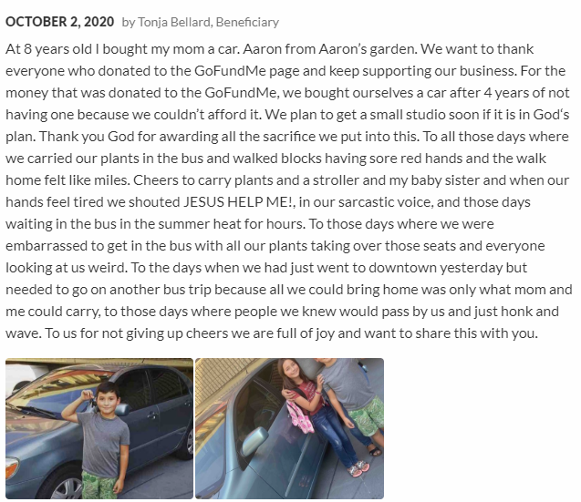 亚伦在GoFundMe 页面的日记上写道:“ 过去因为买不起车,我们只能坐公交车或步行搬运植物……每次坐公交时我们都很尴尬,我的植物占满所有座位,每个人都奇怪地看着我们……”