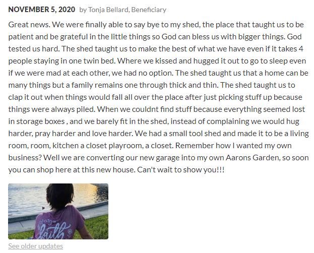 当时亚伦写道:“好消息,我们终于可以和以前的房子告别了,以前的生活是上帝对我们的艰苦考验,我们从中学到要耐心并在小事上心存感激……”