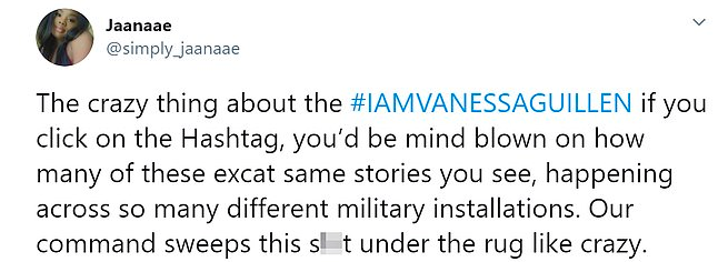 有网友发推说:疯狂的点在于,如果你点开#IAMVANESSAGUILLEN的话题标签,你会惊讶于看到这么多相同的故事,发生在这么多不同的军事场所中。我们的指挥官把这件事彻底掩盖了起来。