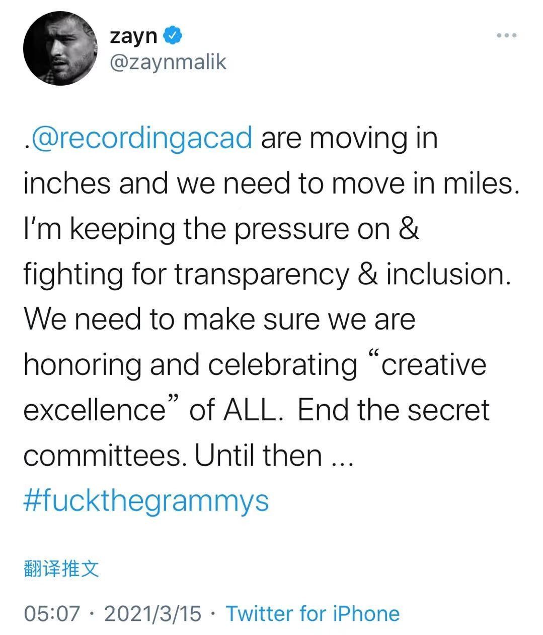 就在今天,美渣再发推称将继续为争取透明度和包容性努力,最后还带着#F**kthegrammys