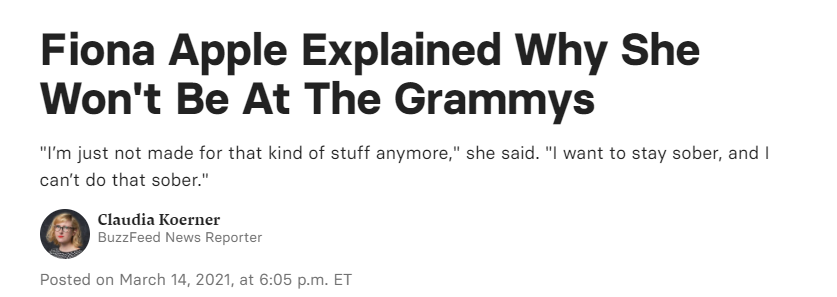 而一向低调的苹果姐Fiona Apple也表示自己不会出现在格莱美上。