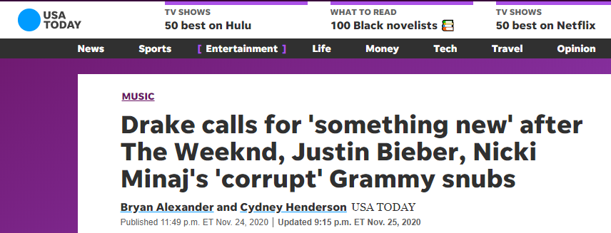 歌手德雷克也借由盆栽哥遭到的冷遇,称格莱美“可能不再重要”: