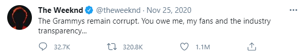 “格莱美仍然腐败。你欠我和我的粉丝、以及这个行业一个公正。”