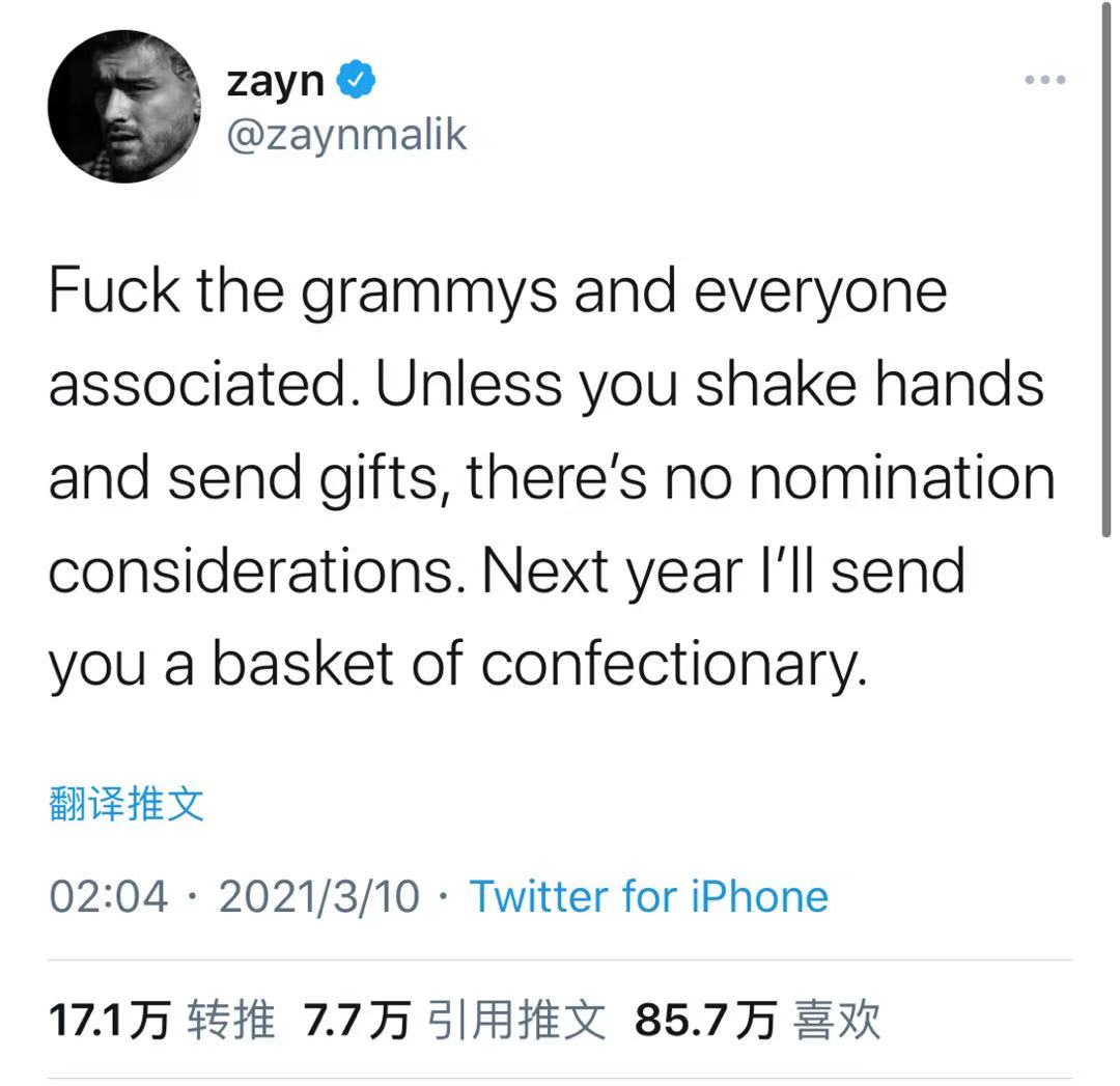 美渣Zayn Malik也数次怒喷格莱美,指其暗箱操作。