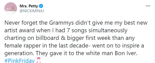 就盆栽发文的同一天,曾经同样未获得提名的麻辣鸡(Nicki Minaj)发文吐槽: