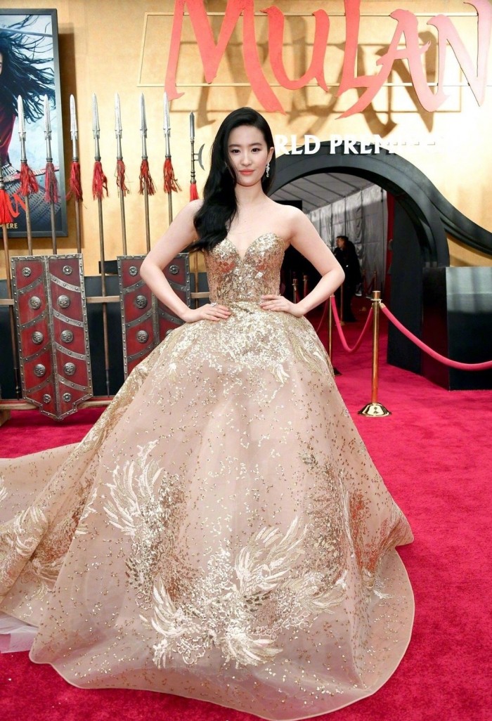 近日迪士尼大片《花木兰》在加州举办首映礼,主演刘亦菲现身红毯,她一头长卷发披肩,身穿金色抹胸拖地礼服气场全开,上面带有凤凰花纹高贵华丽,妆容精致美艳动人。刘亦菲全程微笑与影迷合影亲切十足。