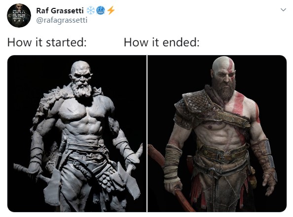 《战神》系列新作已经确定将于2021年在PS5平台推出,但是目前具体发售时间和游戏细节尚未公布。近日,《战神4》艺术总监Raf Grassetti放出来一张《战神4》奎托斯最初的还在CG灰模阶段的造型设计图,和最终版差异还是很大的。