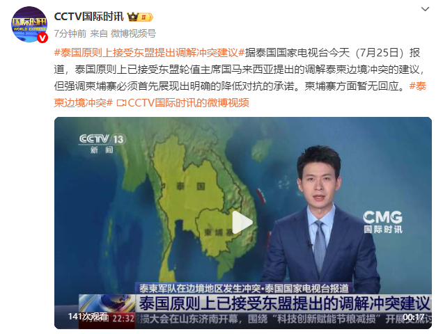据泰国国家电视台今天(7月25日)报道,泰国原则上已接受东盟轮值主席国马来西亚提出的调解泰柬边境冲突的建议,但强调柬埔寨必须首先展现出明确的降低对抗的承诺。柬埔寨方面暂无回应。