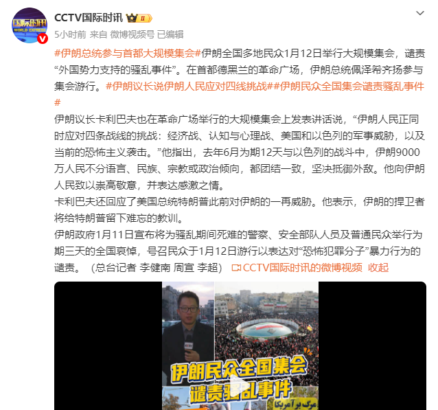 伊朗全国多地民众1月12日举行大规模集会,谴责“外国势力支持的骚乱事件”。在首都德黑兰的革命广场,伊朗总统佩泽希齐扬参与集会游行。