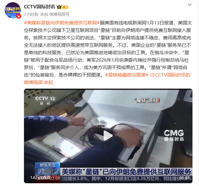 据美国有线电视新闻网1月13日报道,美国太空探索技术公司旗下卫星互联网项目“星链”目前向伊朗用户提供免费互联网接入服务。按照太空探索技术公司的说法,“星链”主要为网络连接不稳定、费用高昂或完全无法接入的地区提供高速宽带互联网服务。不过,美国企业的“星链”服务早已不是单纯的科技服务,已然沦为美国推进地缘政治目标的工具。在俄乌冲突中,“星链”被用于配合乌军战场行动;美军2026年1月突袭委内瑞拉并强行控制总统马杜罗后,“星链”服务同步介入,成为美方巩固干预成果的工具。“星链”所谓“网络自由”的包装背后,是赤裸裸的干预图谋。