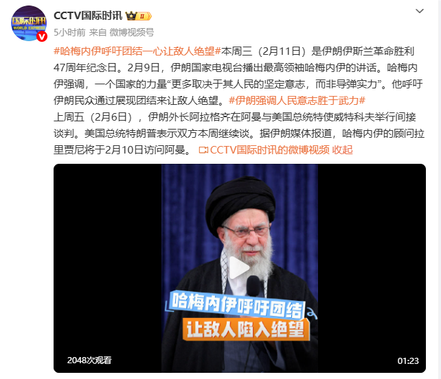 本周三(2月11日)是伊朗伊斯兰革命胜利47周年纪念日。2月9日,伊朗国家电视台播出最高领袖哈梅内伊的讲话。哈梅内伊强调,一个国家的力量“更多取决于其人民的坚定意志,而非导弹实力”。他呼吁伊朗民众通过展现团结来让敌人绝望。