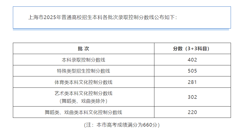 上海市2025年普通高校招生本科各批次录取控制分数线公布如下: