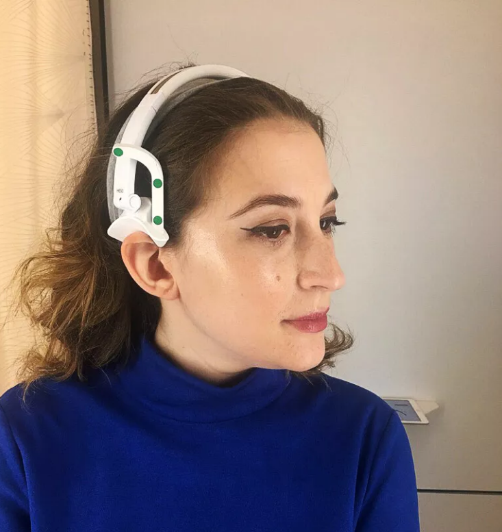 第一次3D扫描并没有成功,工作人员给我戴上一个塑料头箍,帮助引导软件确定我耳朵的轮廓和位置。