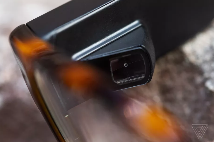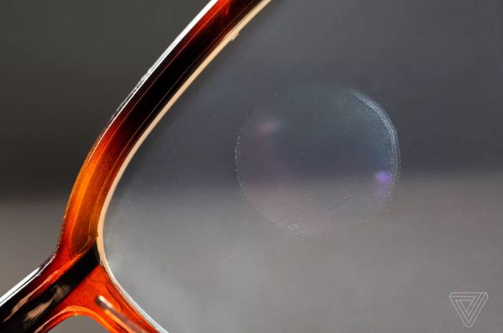 上周,笔者在该公司位于纽约布鲁克林区的新店(new Brooklyn, new York store)见到了North首席执行官斯蒂芬⋅雷克(Stephen Lake)时,当时他正戴着一副Focals智能眼镜。右侧镜片靠近镜架的一小块位置是眼镜的显示区域,咋一看就像是一块污迹。镜片显示区域的光聚合物材料在大多数情况下并不突兀,但在反光时给人一种眼镜片脏了的感觉。