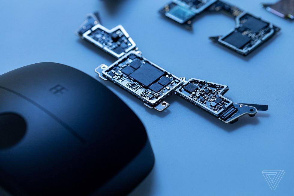 莱德贝特研究团队通过移动设备最重的部分来移动重心:主处理器和电池现在位于设备后部的一个模块中,头带内的导线一直延伸到显示板和前面的组件。值得注意的是,HoloLens 2所采用的是基于ARM的高通骁龙850芯片,功耗更低,这意味着整个设备所配置的电池更小。