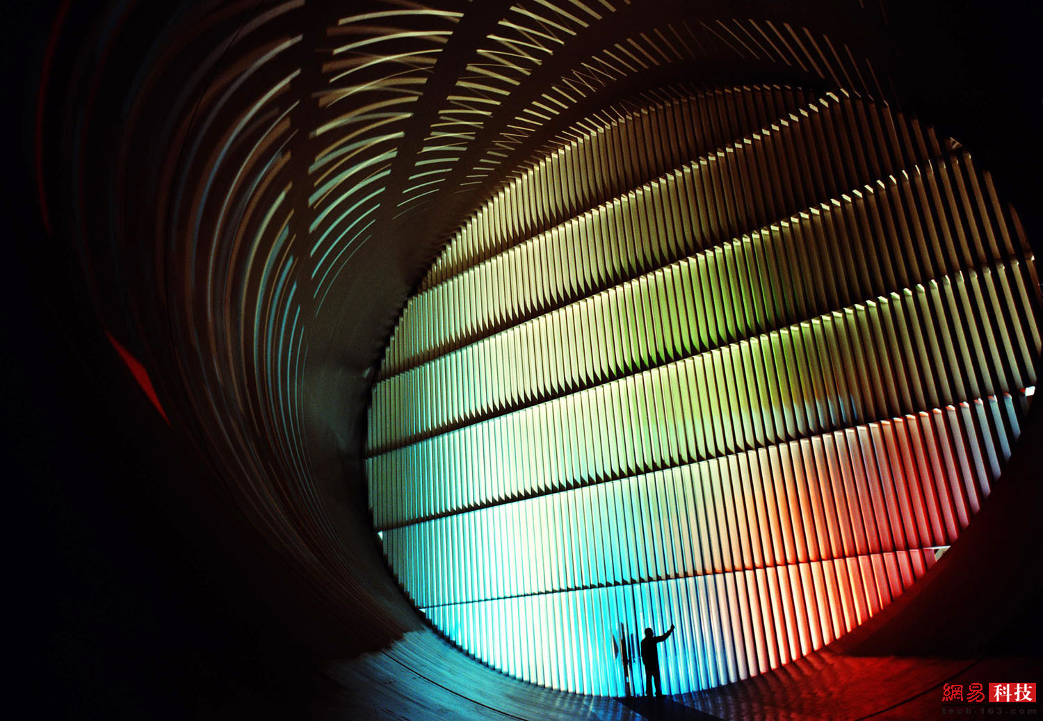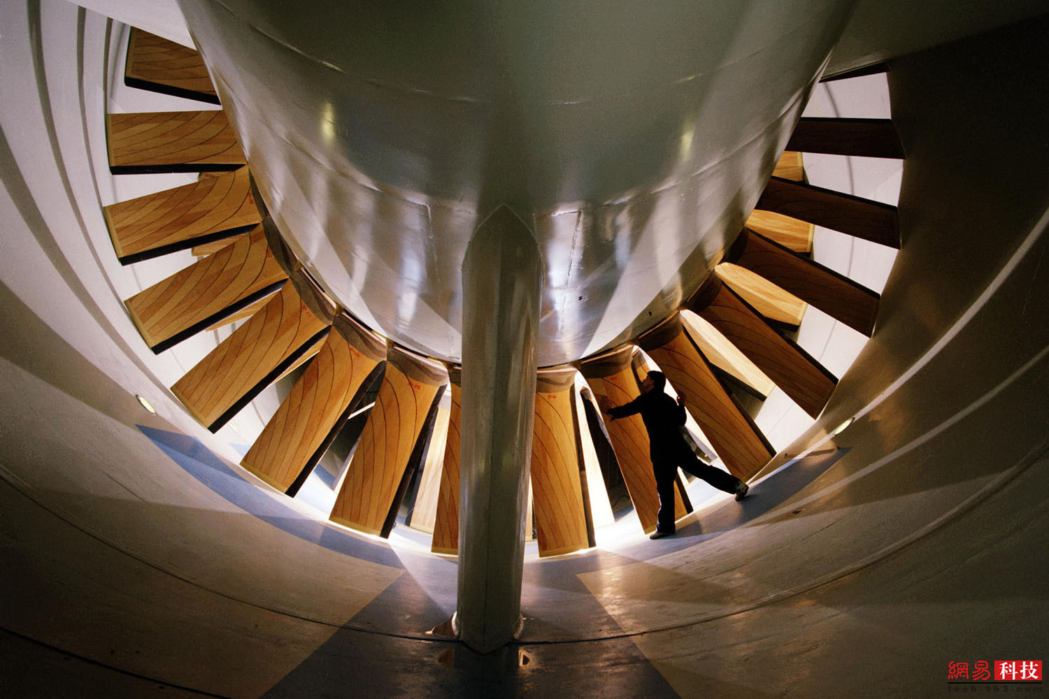 2010年3月,在弗吉尼亚州汉普顿美国宇航局下属的兰利研究中心,一名技术人员正准备打开通向跨音速风洞导叶的门。这个风洞是兰利研究中心几十个研究设施之一,建于1939年,一直运营到2004年,当时它按照“优化政府拥有的风洞”计划退役。在“跨音速”或超音速测试时,测试区域的空气时速可达240-1600公里之间。导叶形成了高近18米、宽25米的椭圆形,并按照45度角切割每个圆柱管。当空气穿过300多米的跑道式封闭管时,风洞另外三个角落里的类似叶片可帮助空气均匀地转动。如果没有导叶,空气就会沿着外面的曲线堆积,行成更加庞大的质量,就像湍急小溪里的水一样。