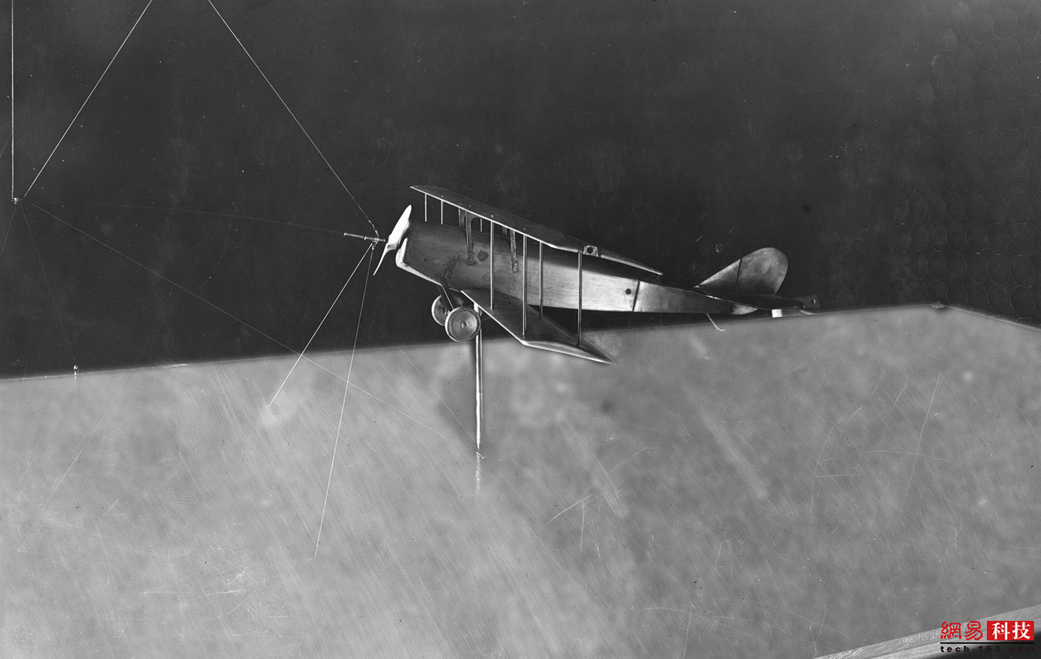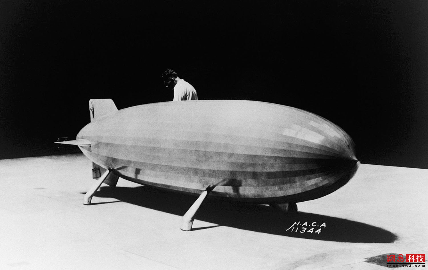 1935年,在全尺寸风洞中,美国海军航空母舰阿克伦号(U.S.S. Akron)的1/40比例模型正在准备进行空气动力学测试。