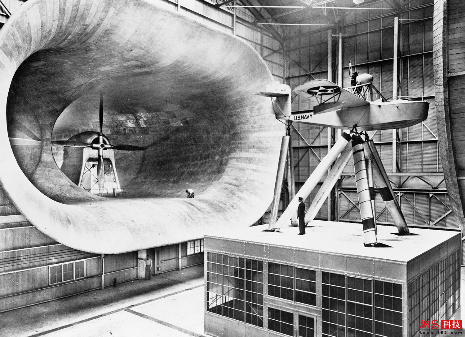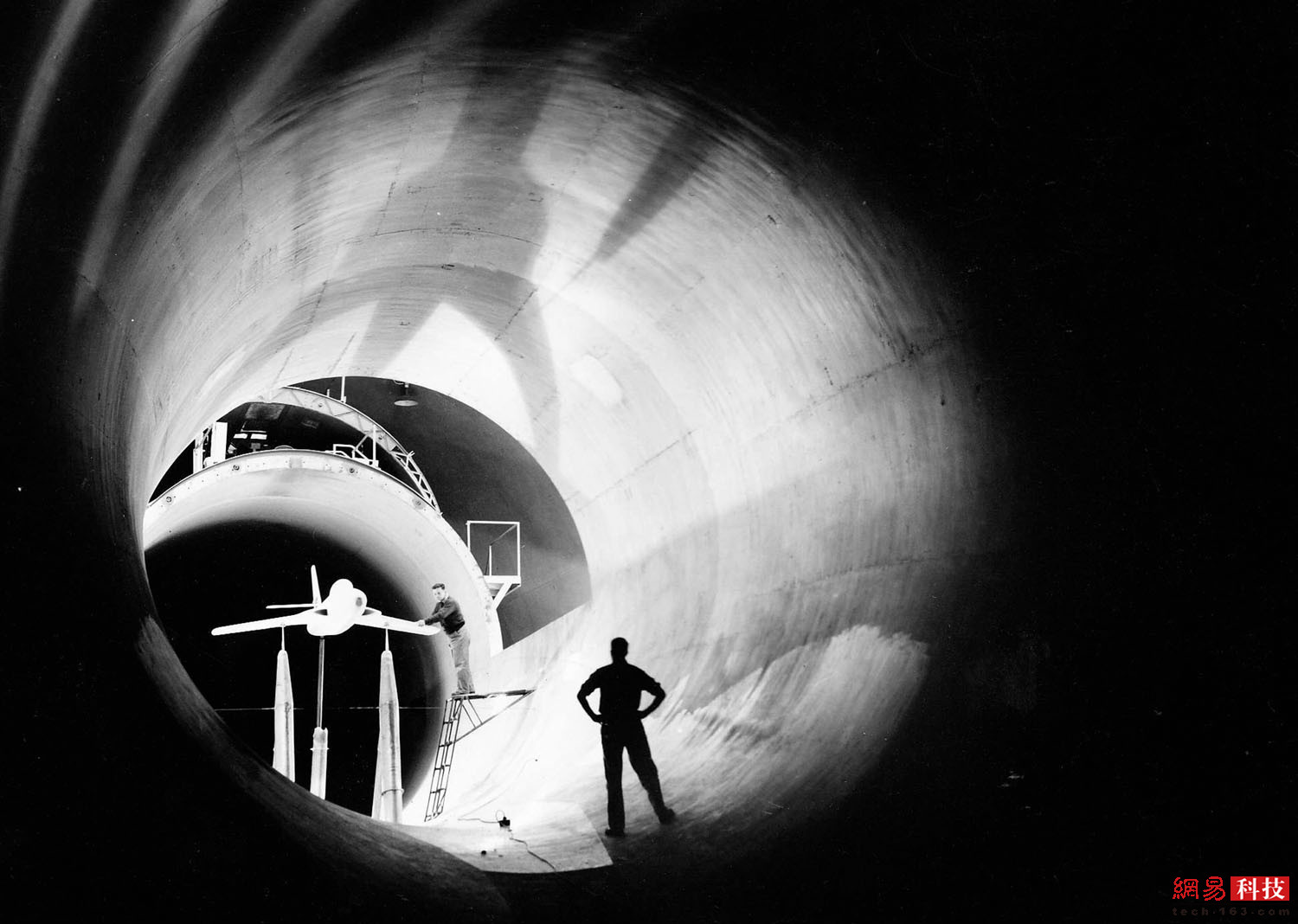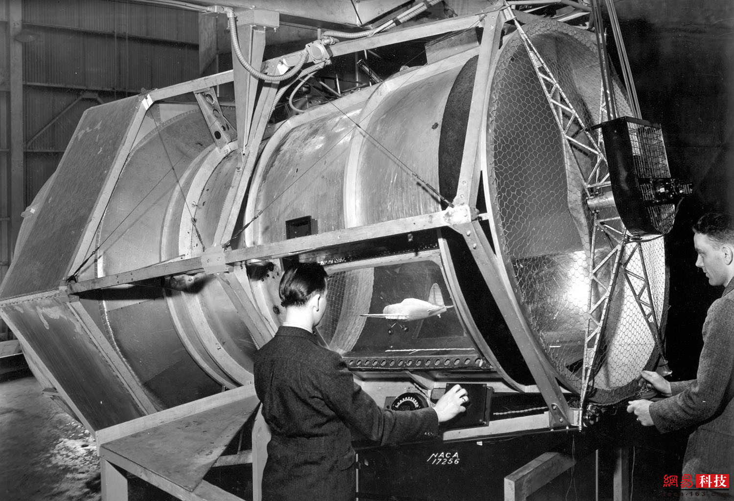 1945年前后,2名男子坐在NACA飞机发动机研究实验室的高空风洞顶上。这个风洞是个巨大的矩形结构,多年来提供了实验室最高的风洞测试。这个风洞长80米,分为南北两条“腿”,东西长37米。风洞的西侧更大,直径为15.5米。
