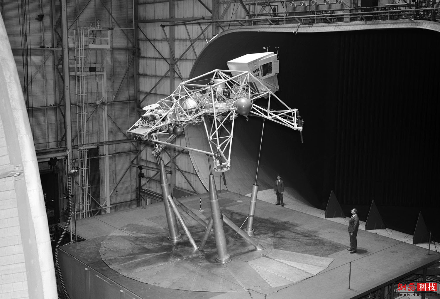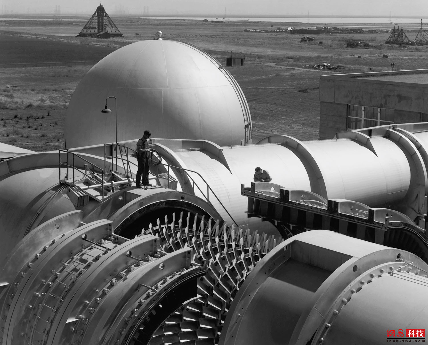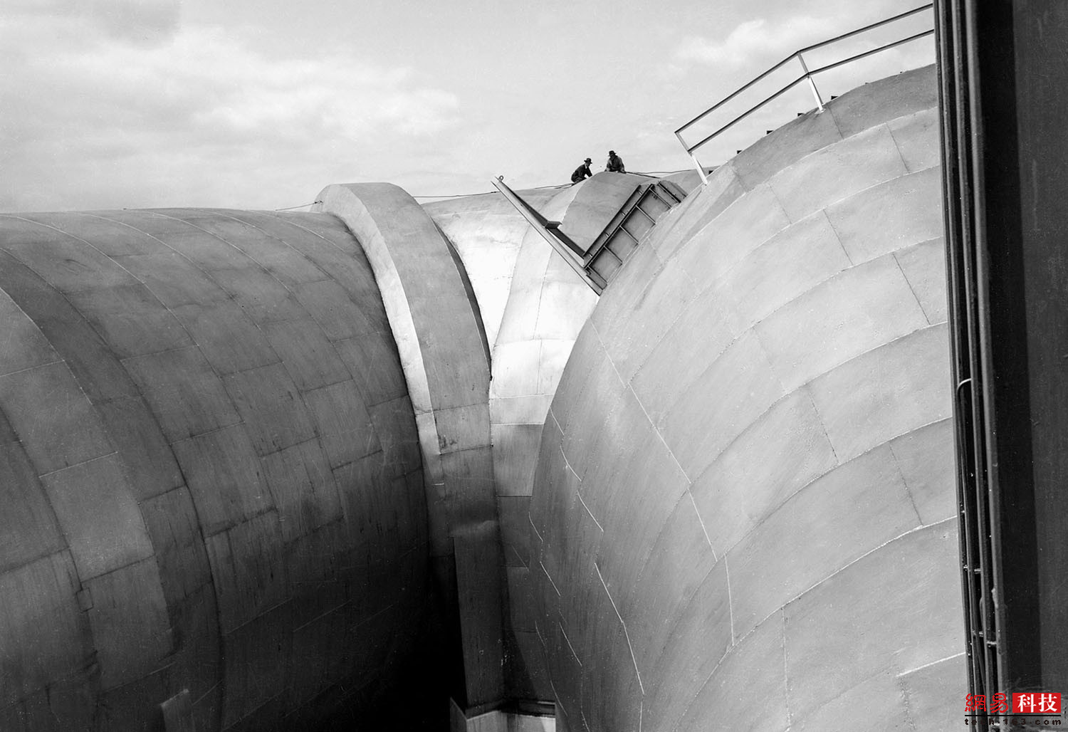 1945年前后,2名男子坐在NACA飞机发动机研究实验室的高空风洞顶上。这个风洞是个巨大的矩形结构,多年来提供了实验室最高的风洞测试。这个风洞长80米,分为南北两条“腿”,东西长37米。风洞的西侧更大,直径为15.5米。