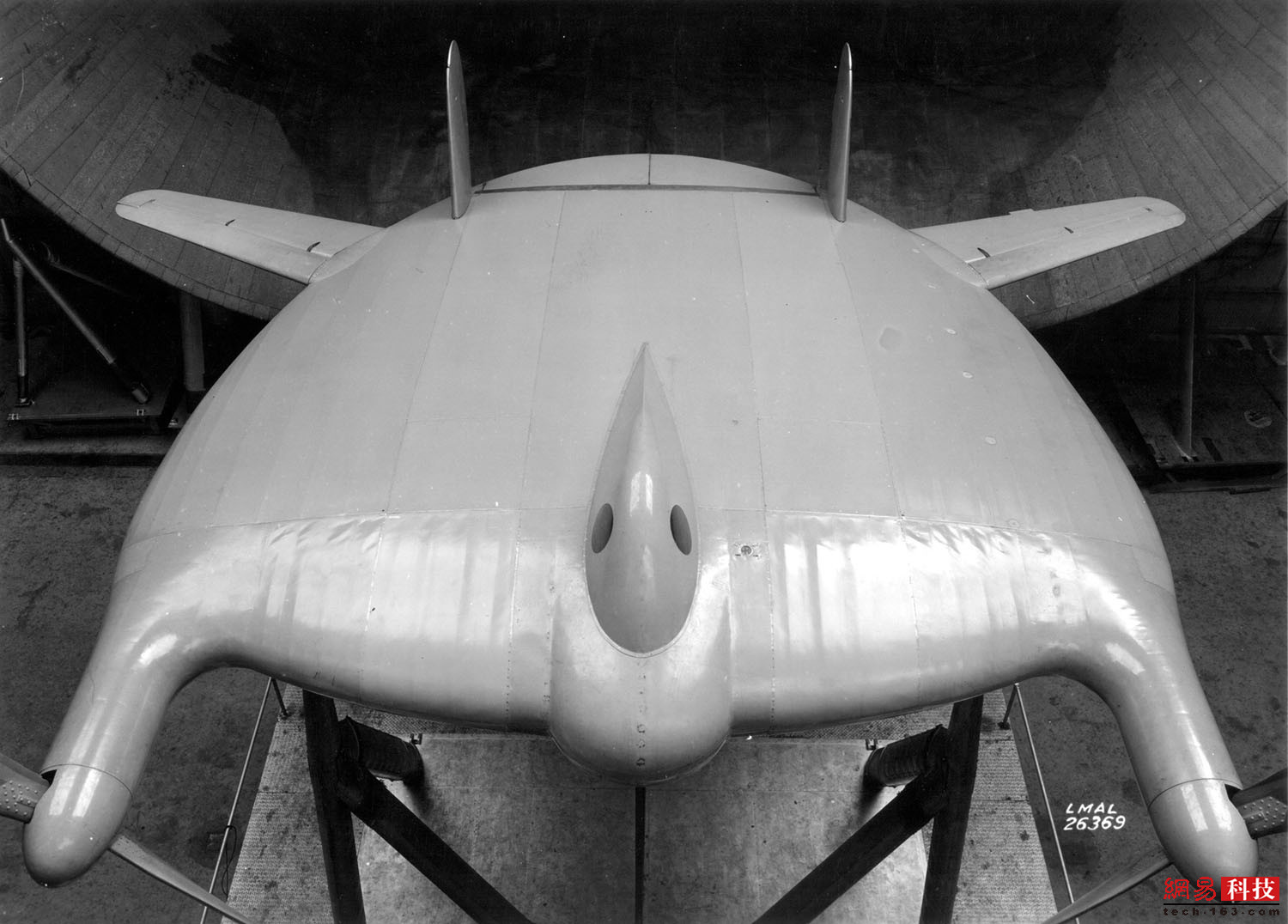 兰利研究中心工程师查尔斯·齐默尔曼(Charles Zimmerman)发明了一种叫做“飞行煎饼”的东西,后被称为Zimmer Skimmer或V-173飞翼。这个概念是为美国海军设计的,以研发可用于舰载舰艇的垂直起降飞机。这是1941年11月28日的风洞测试中,XF5U“飞行薄饼”原型的视图。