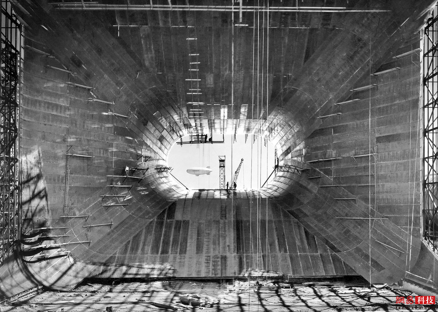 1943年7月,在艾姆斯研究中心,12米X24米风洞的施工视图,背景中可以看到飞行的飞艇。