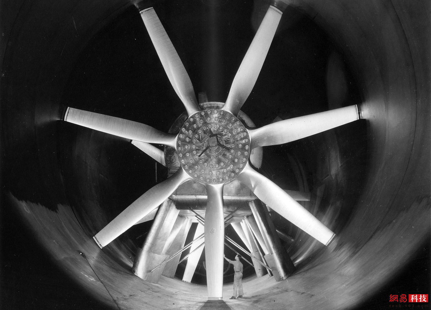 1943年,一名男子站在4.8米高速风洞风扇叶片旁。