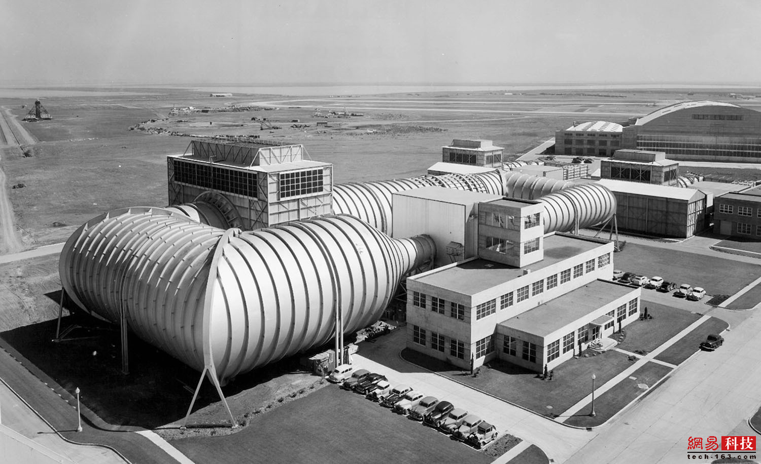 1943年7月在艾姆斯研究中心建造的12米X24米风洞。建筑工程始于1941年底,庞大的建筑任务对新中心的资源造成了沉重负担。两年半之后,也就是1944年6月,这个风洞开始全面投入使用。