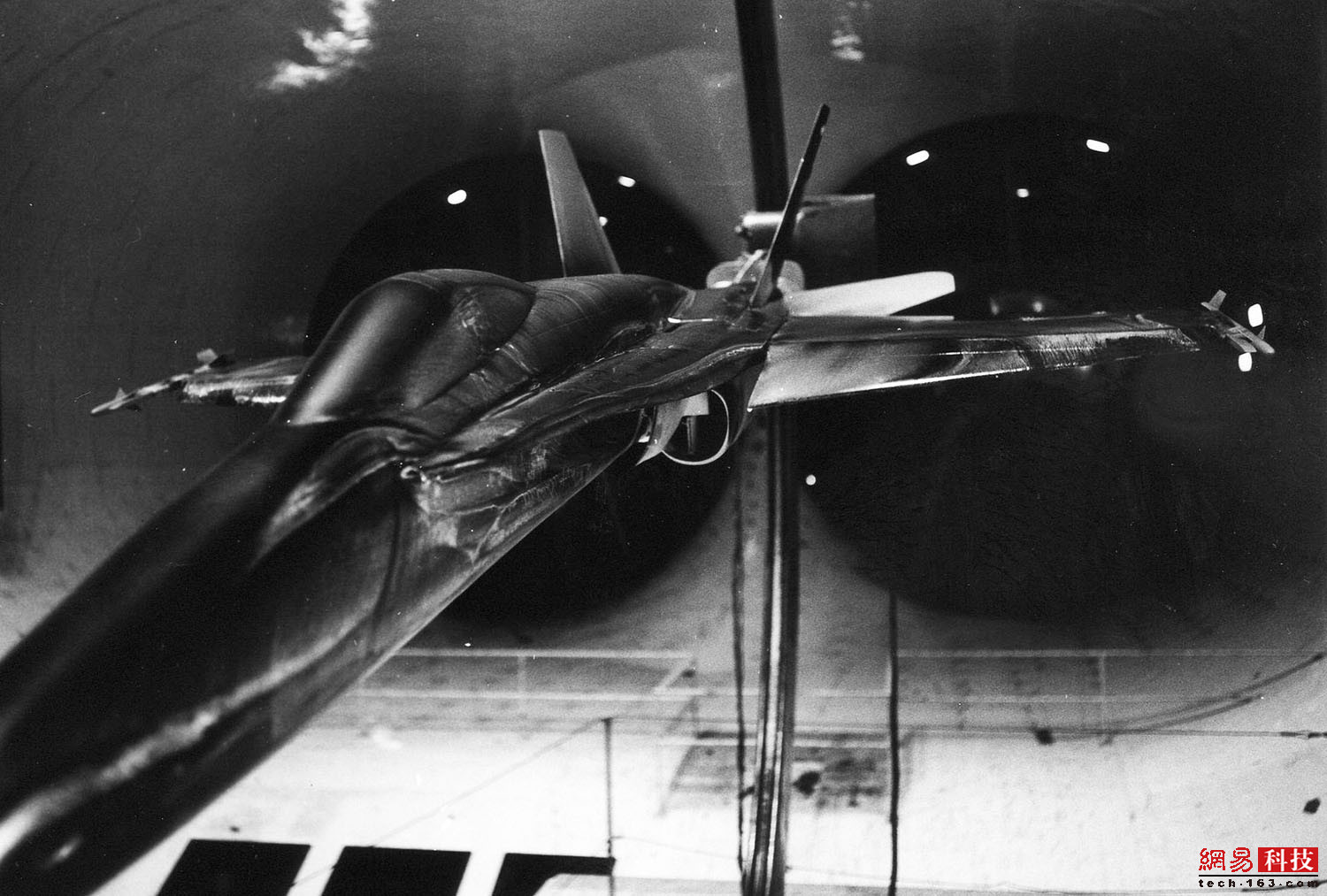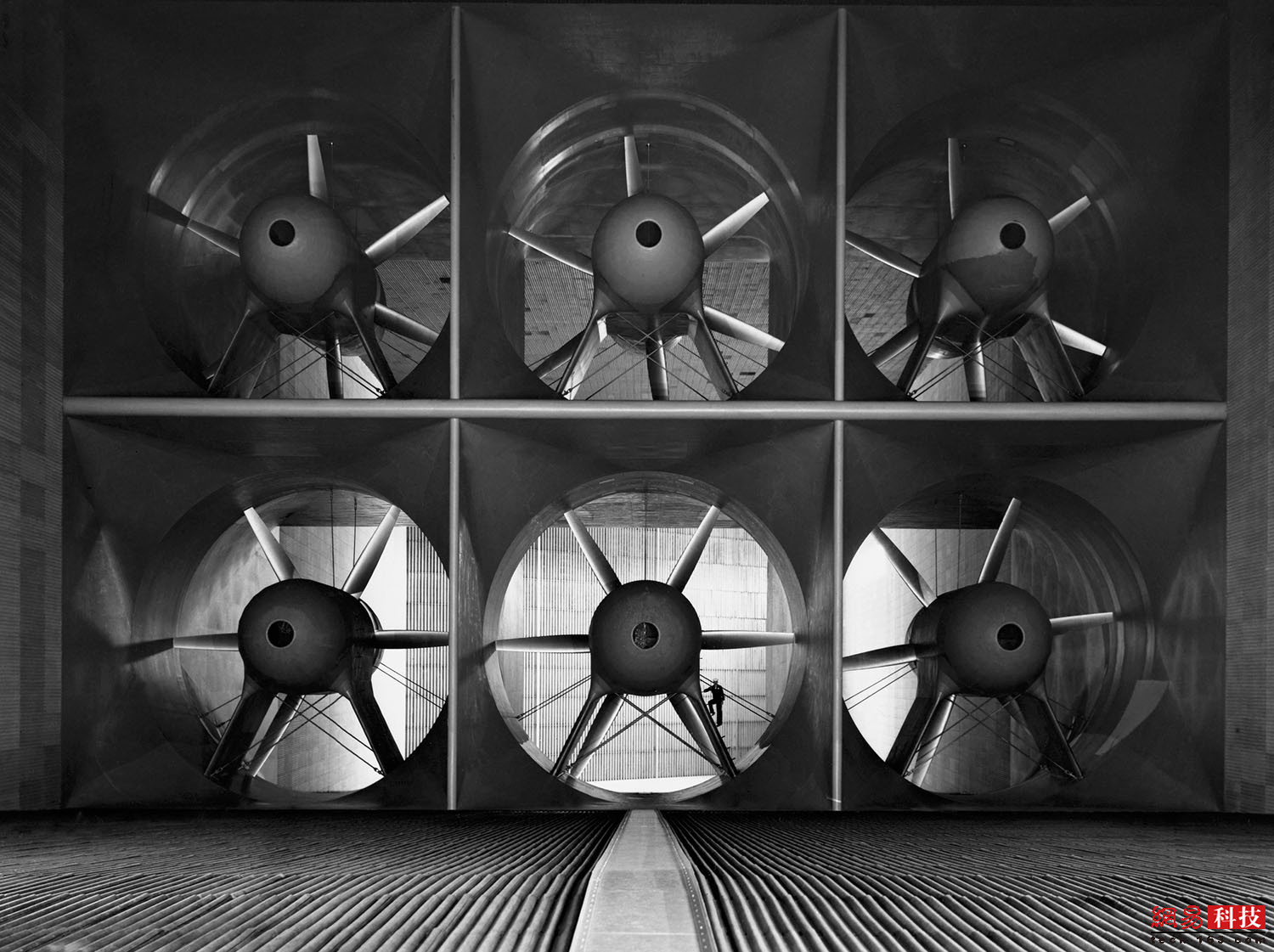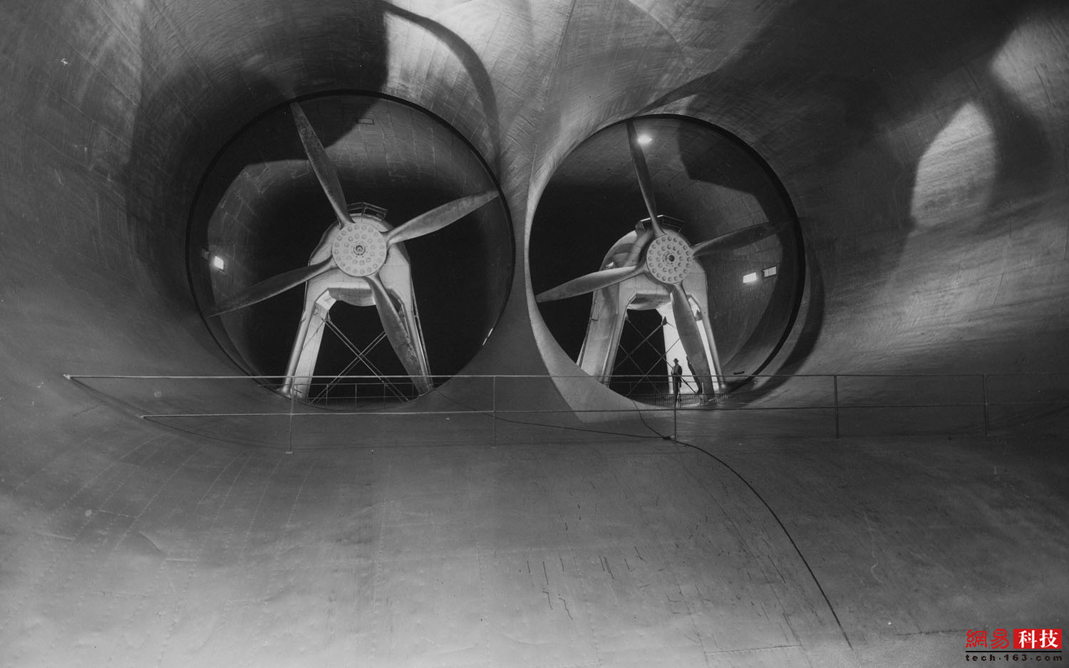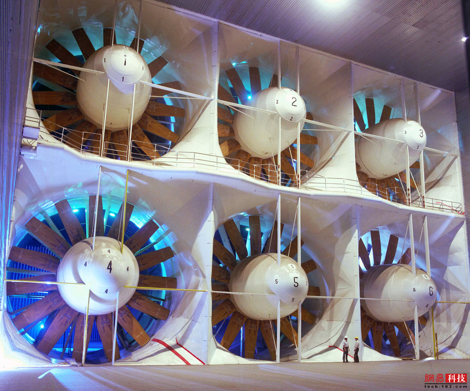 摄于1944年6月9日的照片显示,6个直径12米的风扇竖立在艾姆斯研究中心12米X24米风洞里,每个都由6000马力的电动马达驱动,能够让气流保持每小时370公里的速度。
