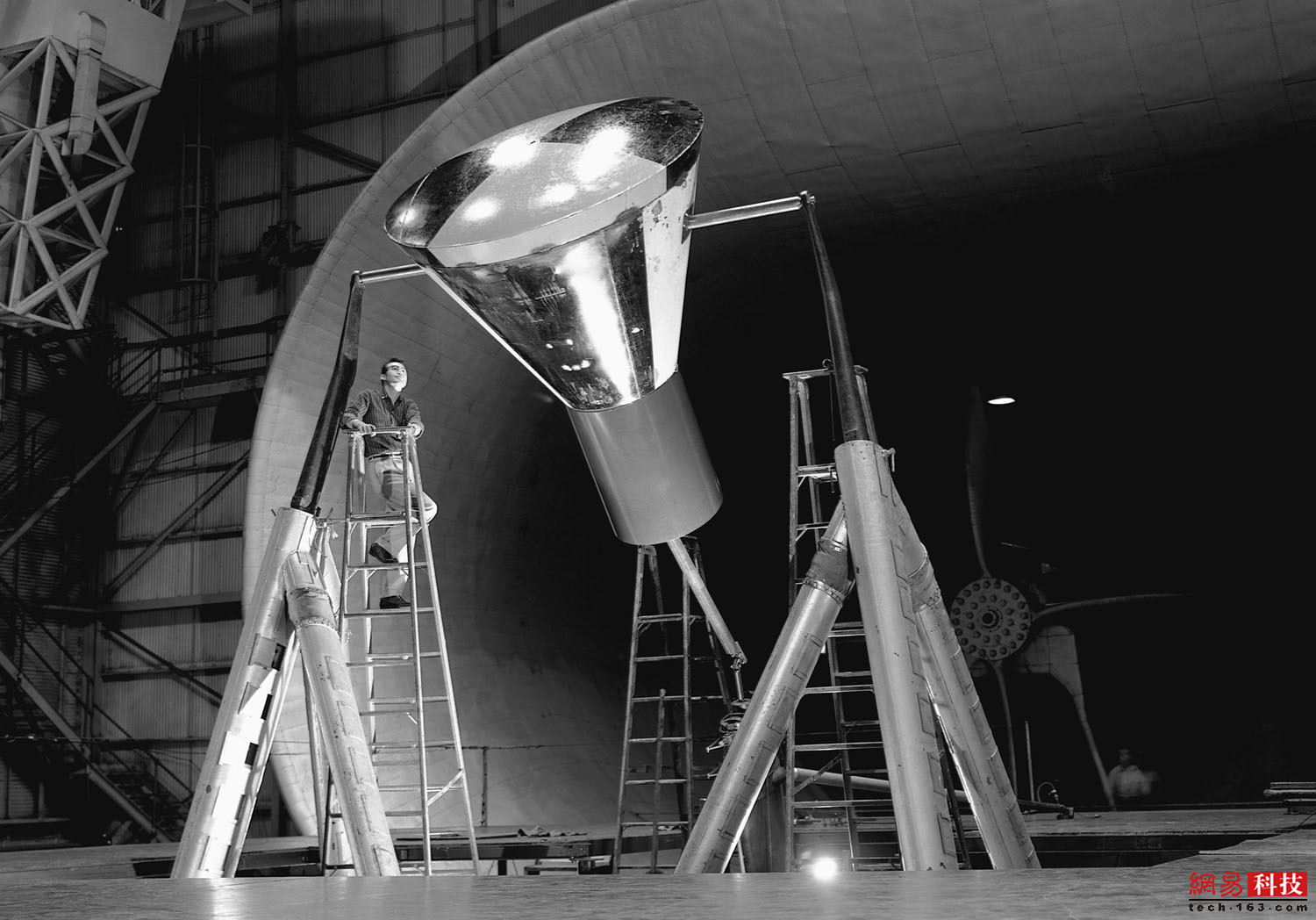 在兰利研究中心9米X18米的风洞测试之前,一名技术人员正在梯子上检查水星(Mercury)太空舱。水星计划早期的大部分工作都是在兰利研究中心进行的。