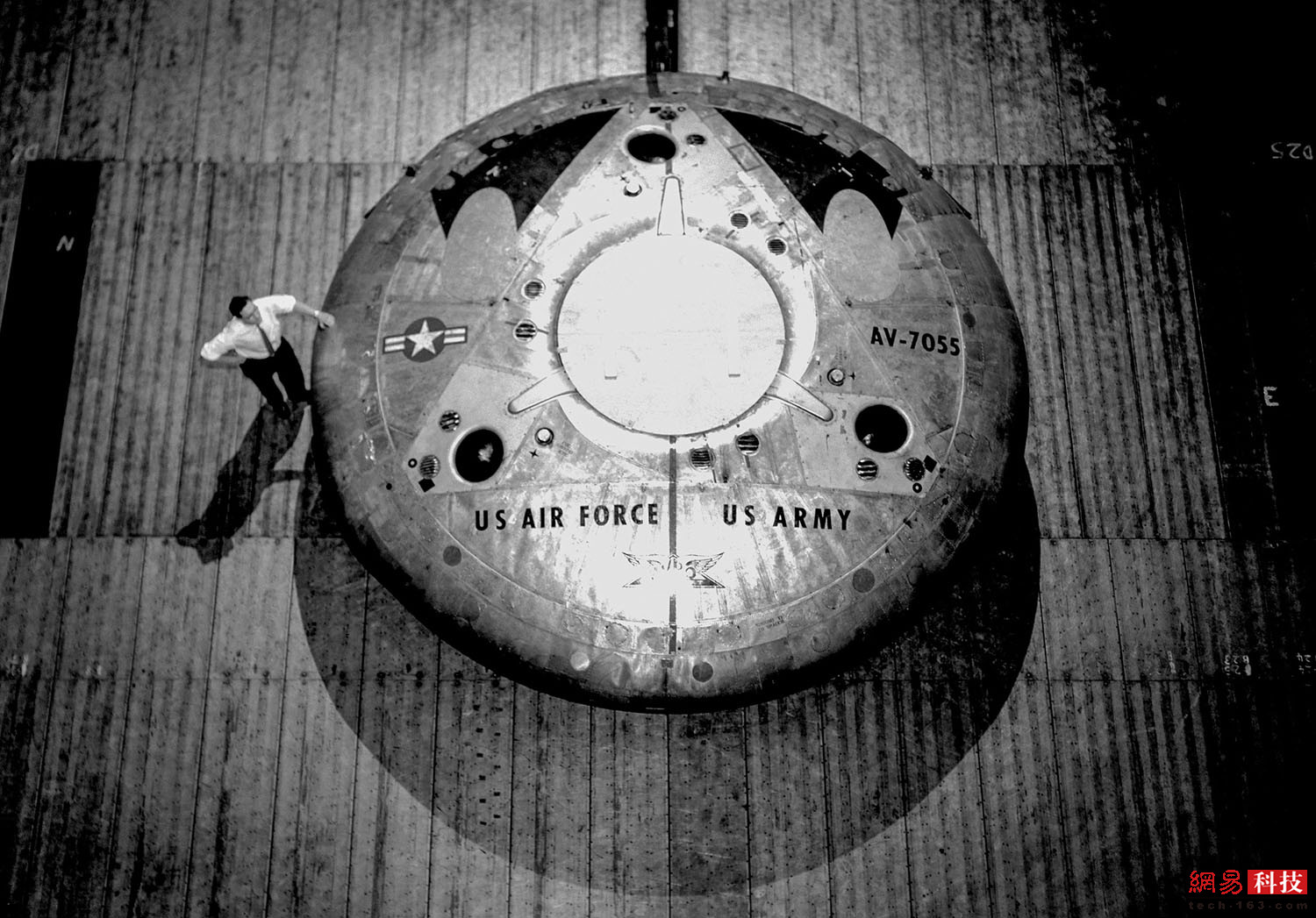 在艾姆斯研究中心12米X24米风洞中,一架Avrocar环状喷气垂直起降飞机俯视图。