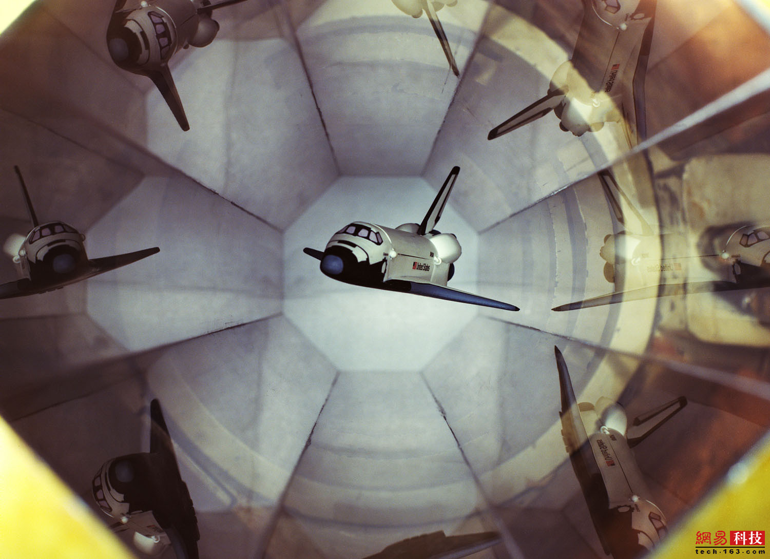 1975年,一架航天飞机模型风洞中进行测试。这次测试模拟航天飞机重新进入大气层时环绕的电离气体进行。