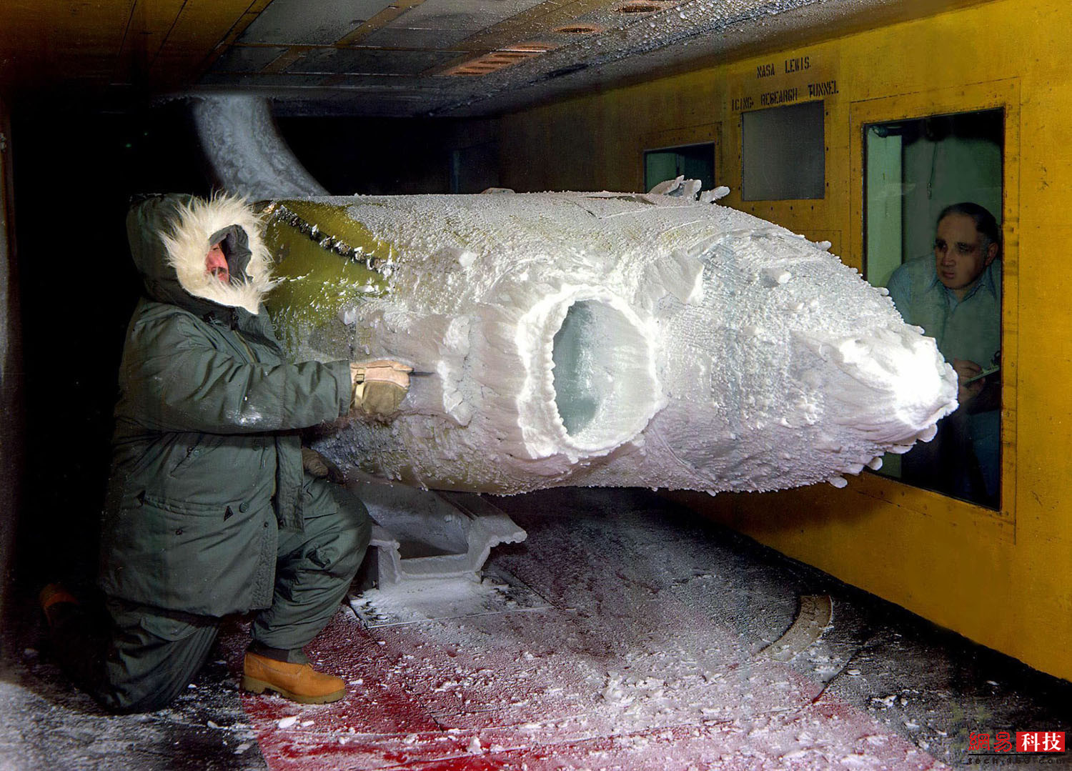 1983年,一名研究人员在结冰研究风洞中研究涡轮螺旋桨引擎机舱上的冰堆积现象。在最佳的云场中,引擎机舱被安装在它的侧面以使它的进气入口处于中心位置。弯曲的排气管道将空气吸入进气通道内,以确保适当的气流进入并环绕它。