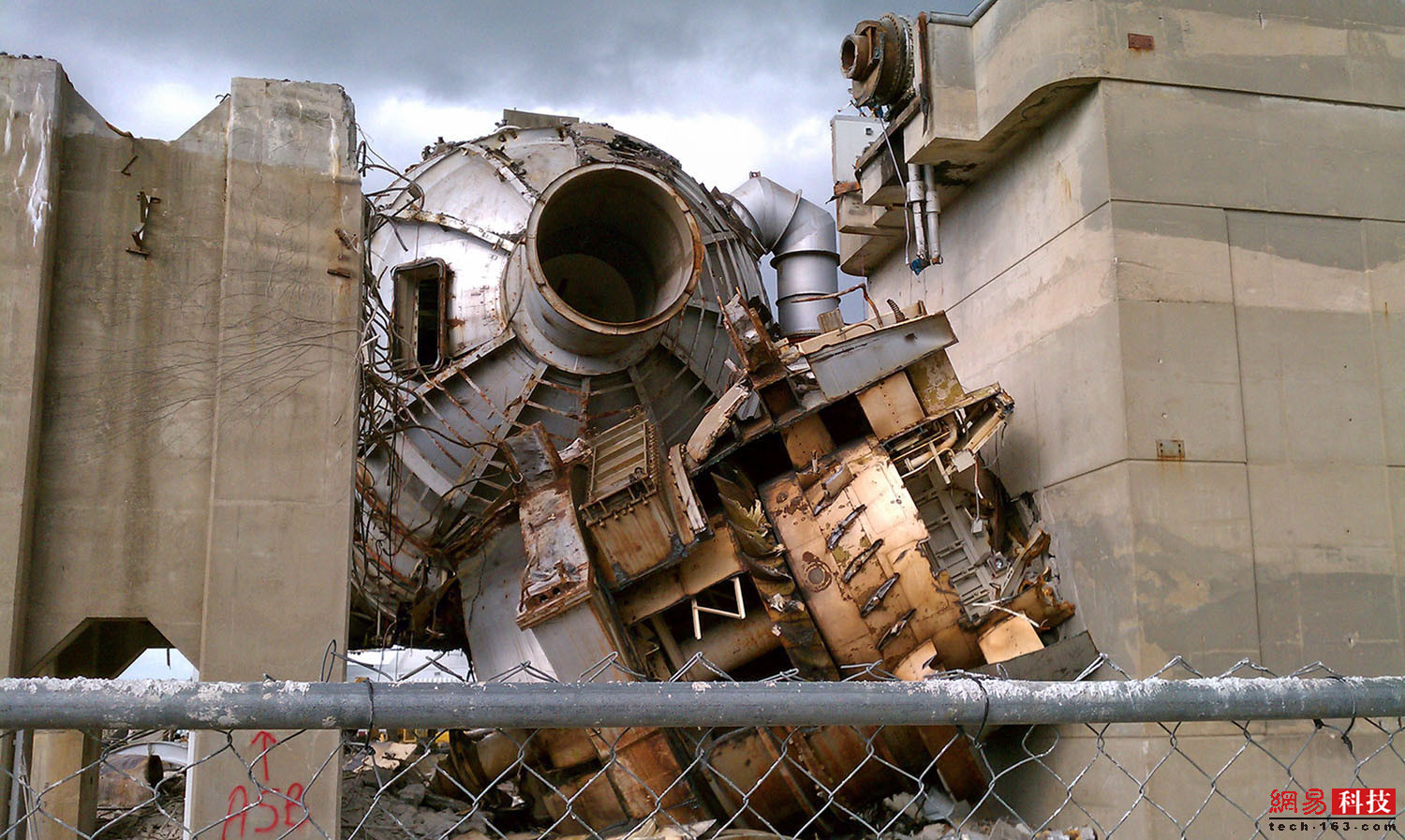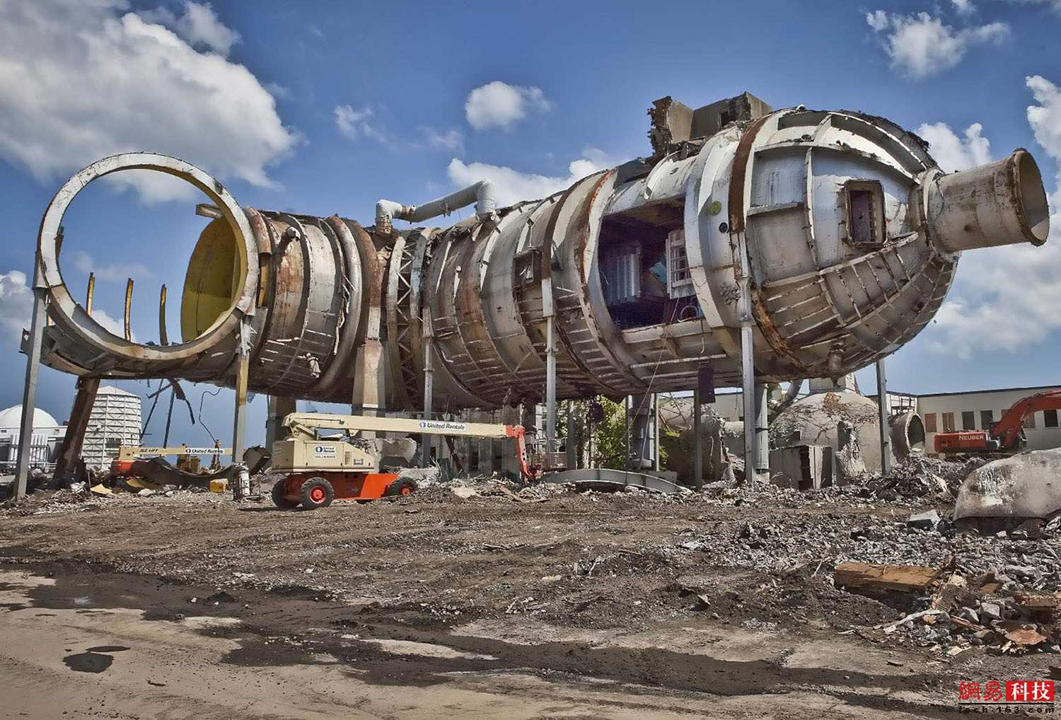 在1996年关闭后,兰利研究中心的跨压力风洞于2011年被拆除。图中显示了一个带有测试单元的金属风洞电路。