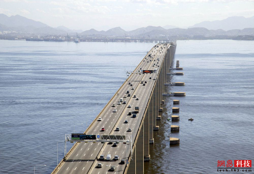 尼特罗伊大桥:巴西瓜纳巴拉湾上的这座箱式梁桥是拉丁美洲最长的桥梁,它也是里约的三大城市象征之一。它的总长度为8.25英里(约13.27千米),从1974年建成到1985年,它一直都占据着世界最长水上桥梁的头衔。