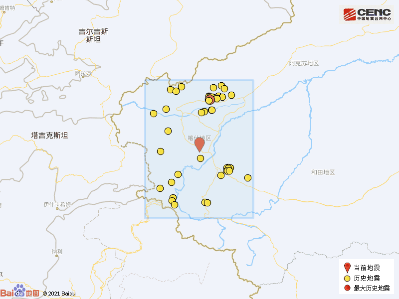 历史地震: 根据中国地震台网速报目录,震中周边200公里内近5年来发生3级以上地震共260次,最大地震是2020年1月19日在新疆喀什地区伽师县发生的6.4级地震(距离本次震中157公里),按震级大小前50次历史地震分布如图。
