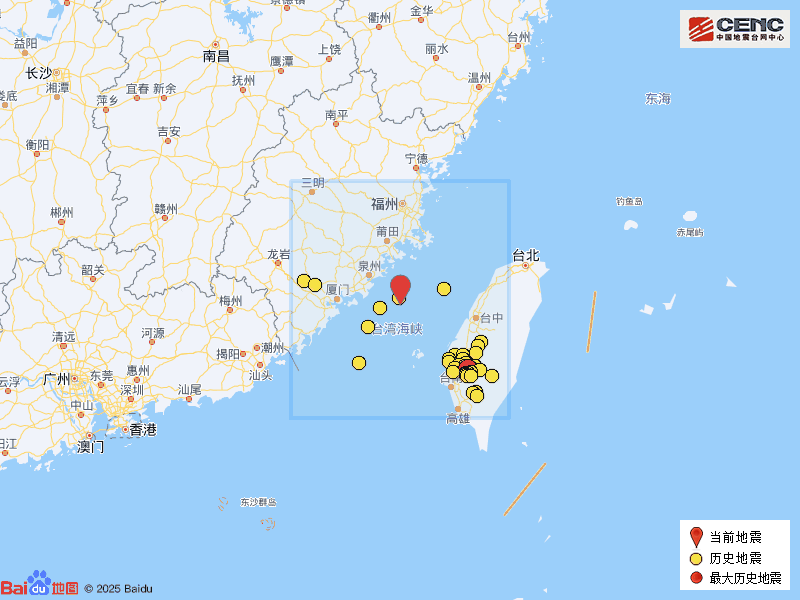 历史地震:根据中国地震台网速报目录,震中周边200公里内近5年来发生4级以上地震共37次,最大地震是2025年1月21日在台湾台南市发生的6.2级地震(距离本次震中189公里),历史地震分布如图。