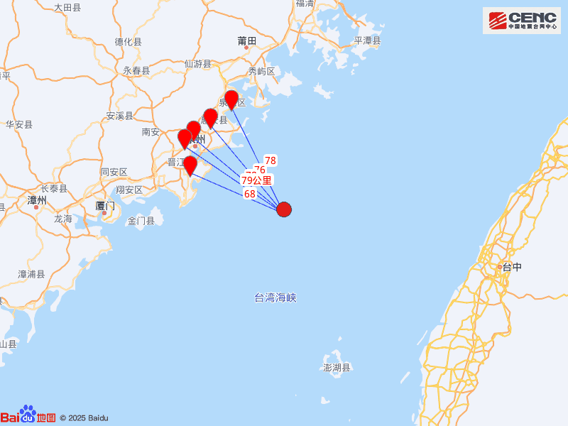 周边县城:震中距福建石狮市68公里、距福建惠安县76公里、距福建??泉港区78公里、距福建??洛江区78公里、距福建??丰泽区79公里,距福建泉州市73公里,距福州市179公里。