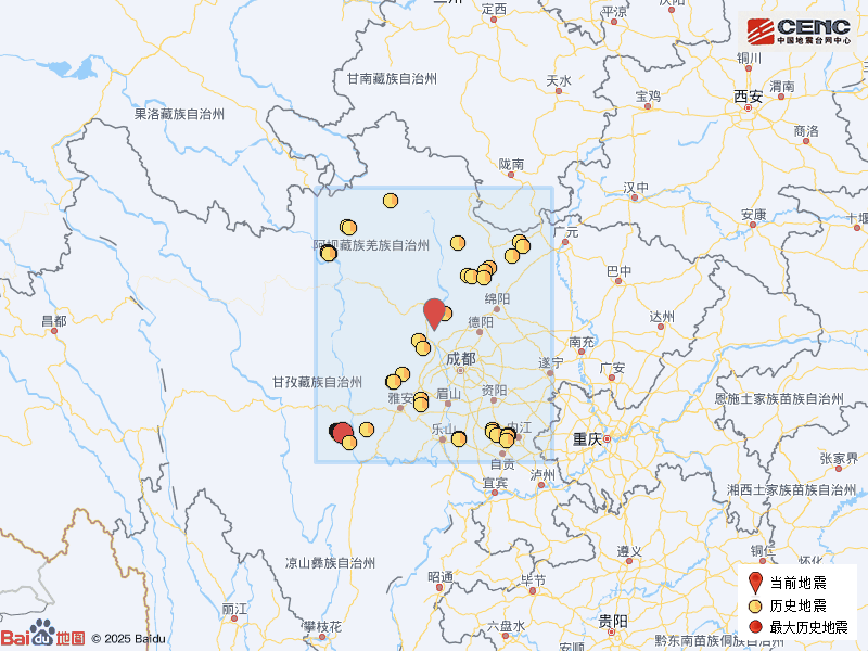 历史地震: 根据中国地震台网速报目录,震中周边200公里内近5年来发生3级以上地震共154次,最大地震是2022年9月5日在四川甘孜州泸定县发生的6.8级地震(距离本次震中237公里),按震级大小前50次历史地震分布如图。