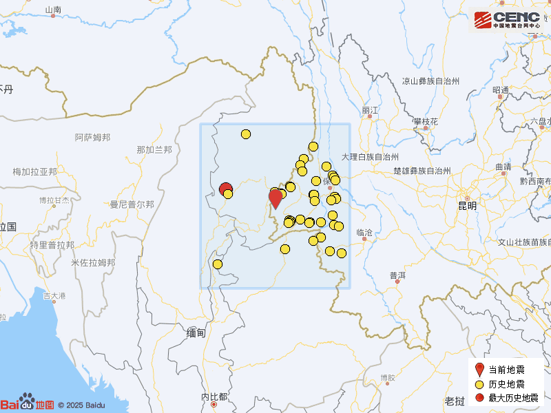 历史地震: 根据中国地震台网速报目录,震中周边200公里内近5年来发生3级以上地震共53次,最大地震是2023年5月31日在缅甸发生的5.7级地震(距离本次震中138公里),按震级大小前50次历史地震分布如图。