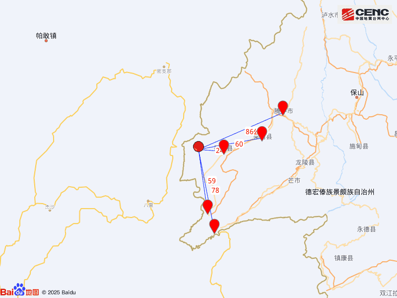 周边县城: 震中距盈江县24公里、距陇川县59公里、距梁河县60公里、距瑞丽市78公里、距腾冲市86公里,距德宏傣族景颇族自治州94公里,距昆明市506公里。