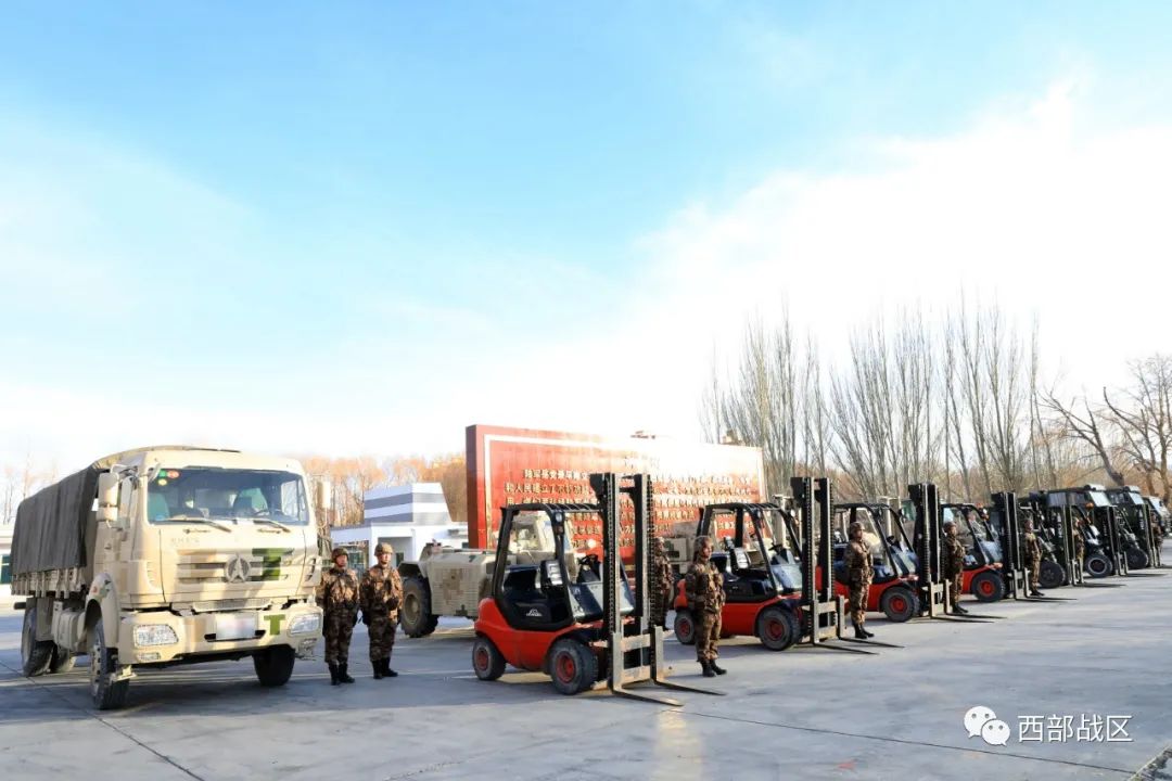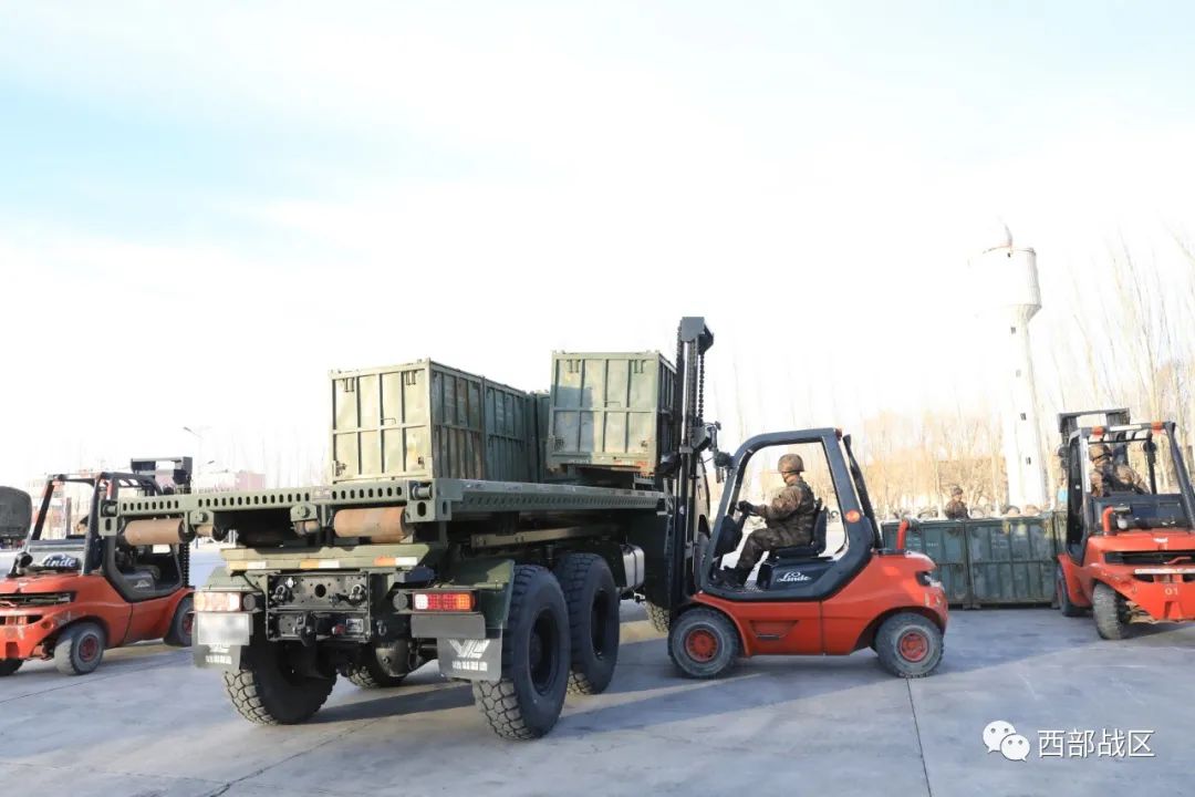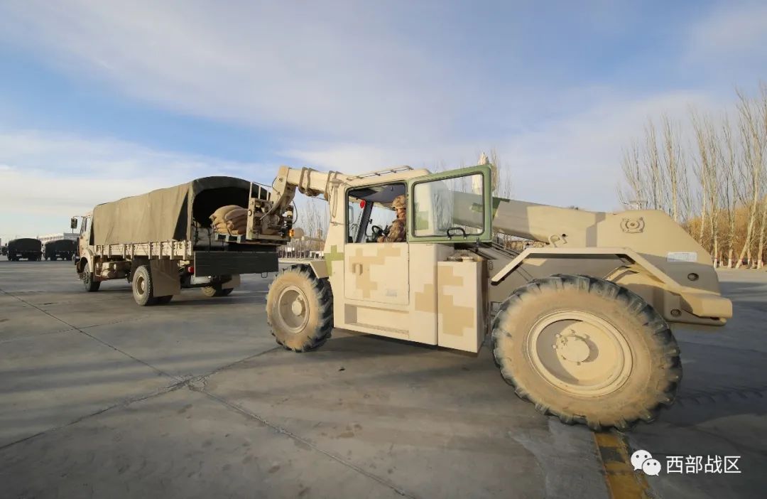 在物资装载训练场,官兵们利用机械化设备按照战时物资携运行标准,迅速完成各类物资装载,保证遂行任务所需。