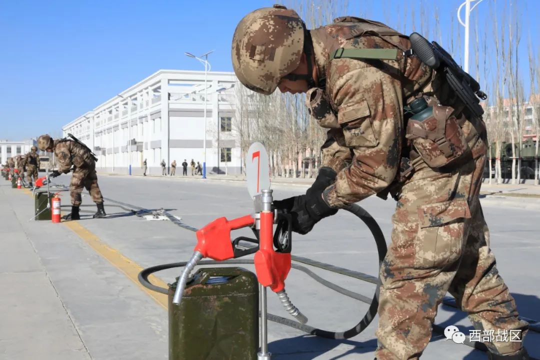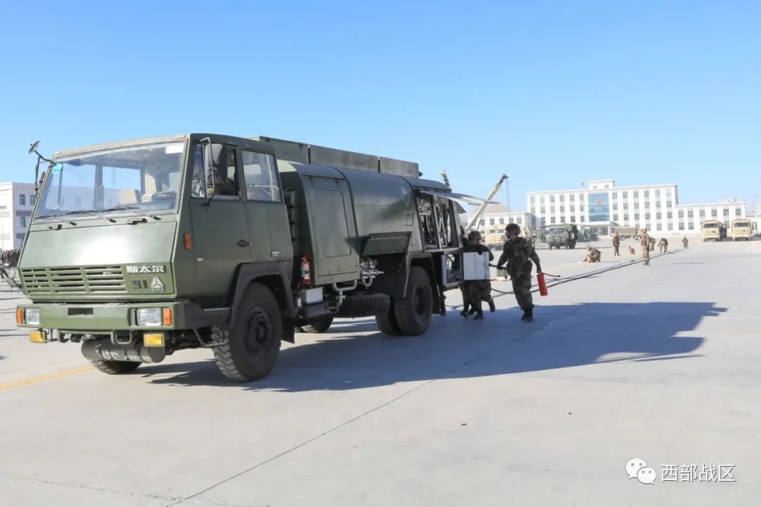 运输车依次排开,参训官兵手提油枪迅速完成车辆油料补给……高效便捷的保障模式为部队执行任务奠定坚实基础。