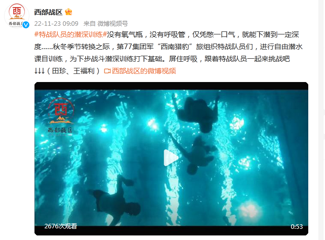 没有氧气瓶,没有呼吸管,仅凭憋一口气,就能下潜到一定深度……秋冬季节转换之际,第77集团军“西南猎豹”旅组织特战队员们,进行自由潜水课目训练,为下步战斗潜深训练打下基础。屏住呼吸,跟着特战队员一起来挑战吧。(田珍、王福利)