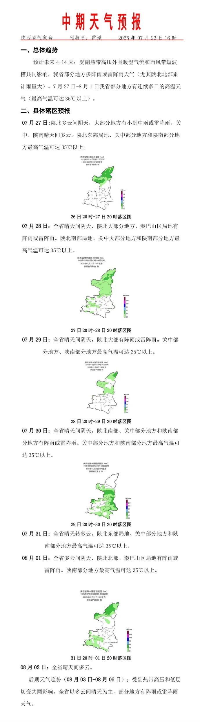 预计未来4-14天:受副热带高压外围暖湿气流和西风带短波槽共同影响,我省部分地方多阵雨或雷阵雨天气(尤其陕北北部累计雨量大)。7月27日-8月1日我省部分地方有连续多日的高温天气(最高气温可达35℃以上)。