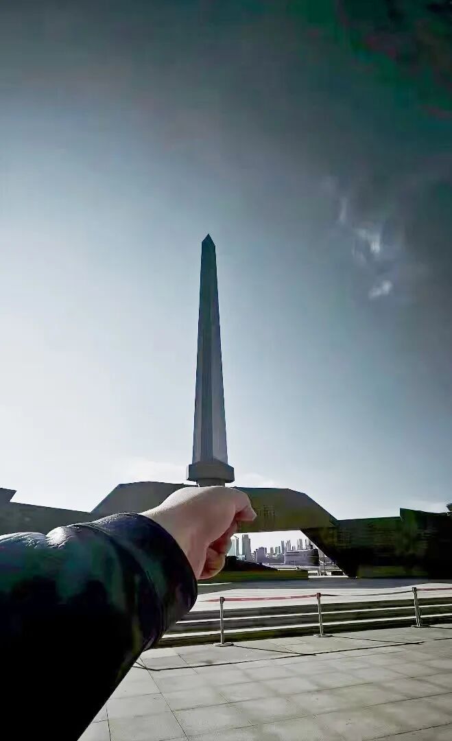 选址定位:这组照片的核心在于错位。拍摄者需要站在雕塑的侧面或斜侧面,利用近大远小的透视原理,将人物的手与雕塑的剑柄部分精准重合。