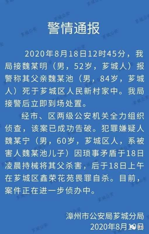 8月20日,芗城警方微信公众号“芗城公安微警务”发布《警情通报》:“2020年8月18日12时45分,我局接魏某明(男,52岁,芗城人)报警称其父亲魏某池(男,84岁,芗城人)死于芗城区人民新村家中。我局接警后立即到场处置。经市、区两级公安机关全力组织侦查,该案已经成功告破。犯罪嫌疑人魏某宁(男,60岁,芗城区人,系被害人魏某池儿子)因琐事矛盾于18日凌晨持械将其父杀害,后于18日上午在芗城区鑫荣花苑畏罪自杀。目前,案件还在进一步侦办中。”