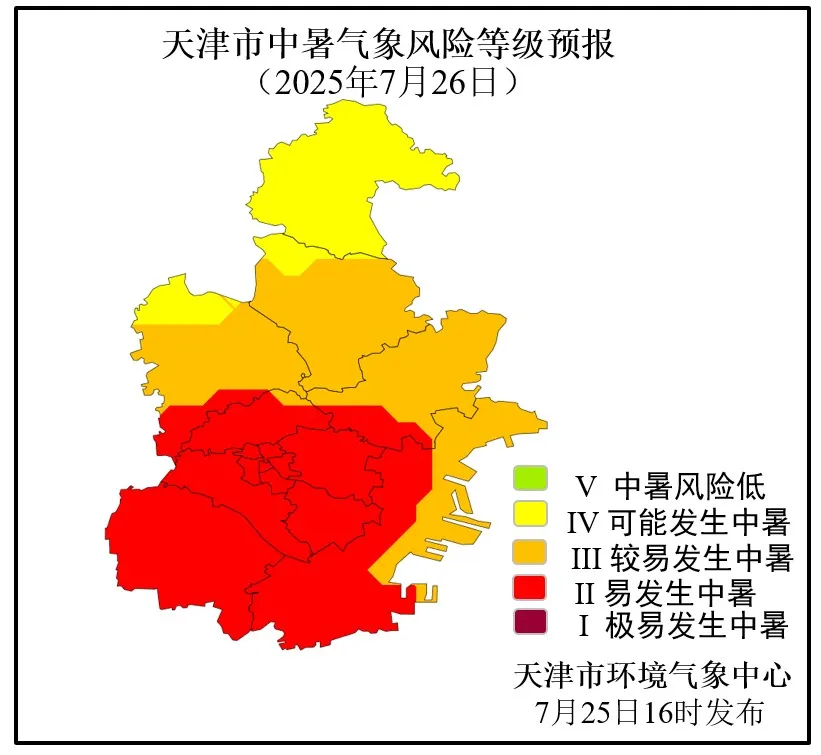 天津市气象台于2025年7月26日6时17分发布高温黄色预警信号:预计7月26日至28日,天津中心城区日最高气温将达35℃或以上,请有关单位和人员做好防范准备。