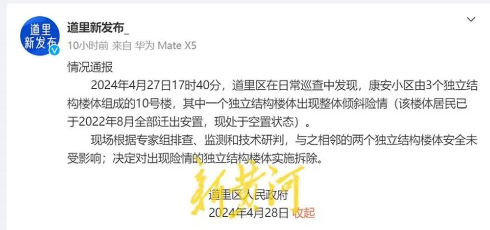 28日凌晨,哈尔滨道里区人民政府发布情况通报:2024年4月27日17时40分,道里区在日常巡查中发现,康安小区由3个独立结构楼体组成的10号楼,其中一个独立结构楼体出现整体倾斜险情(该楼体居民已于2022年8月全部迁出安置,现处于空置状态)。现场根据专家组排查、监测和技术研判,与之相邻的两个独立结构楼体安全未受影响;决定对出现险情的独立结构楼体实施拆除。