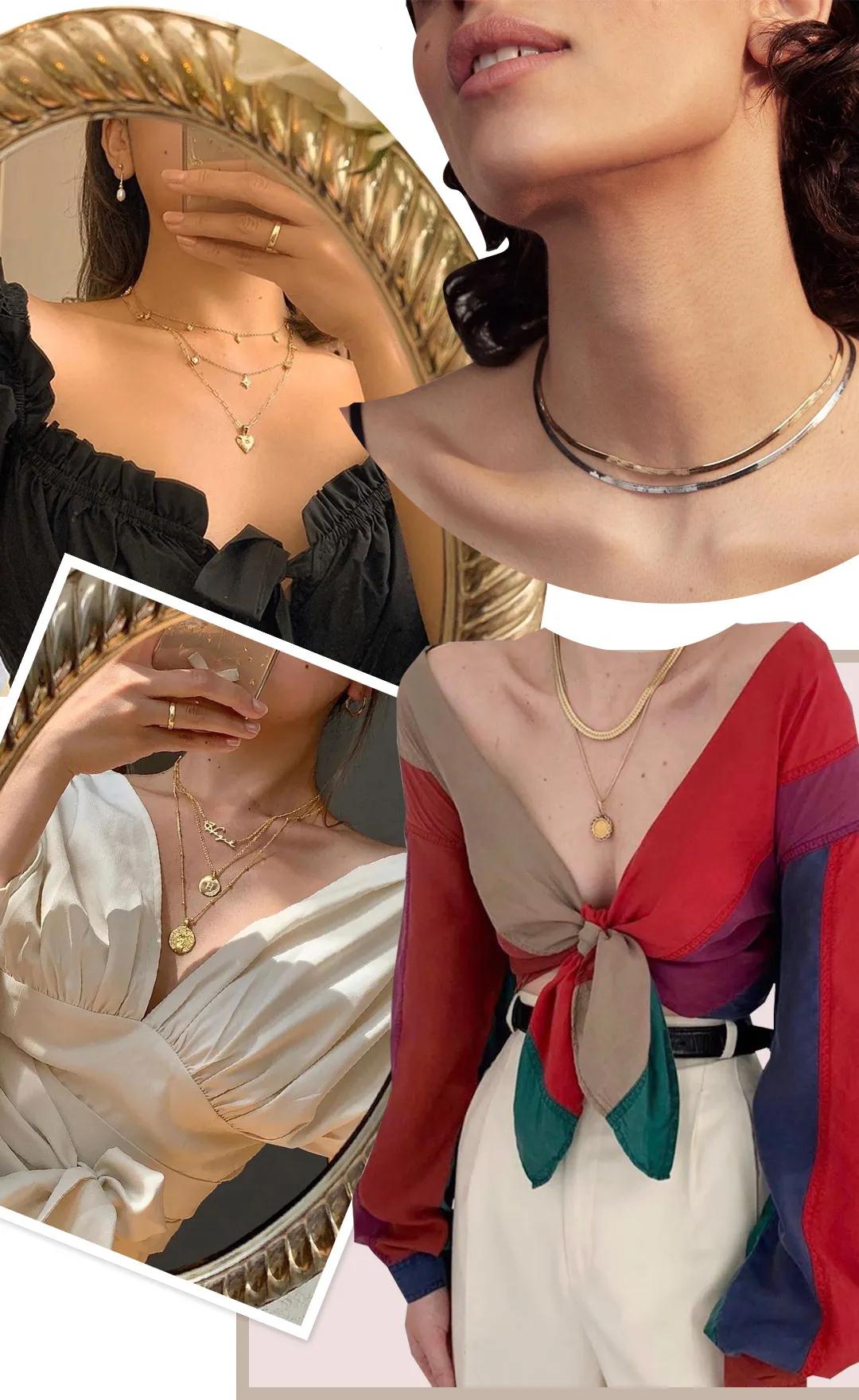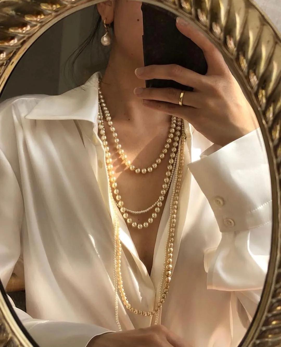 项链叠加和叠戴的关键,在于几条项链间长短、粗细差异打造出的层次,让项链按U字型、V字型排列开来,会让你的颈部视觉上看起来更修长。