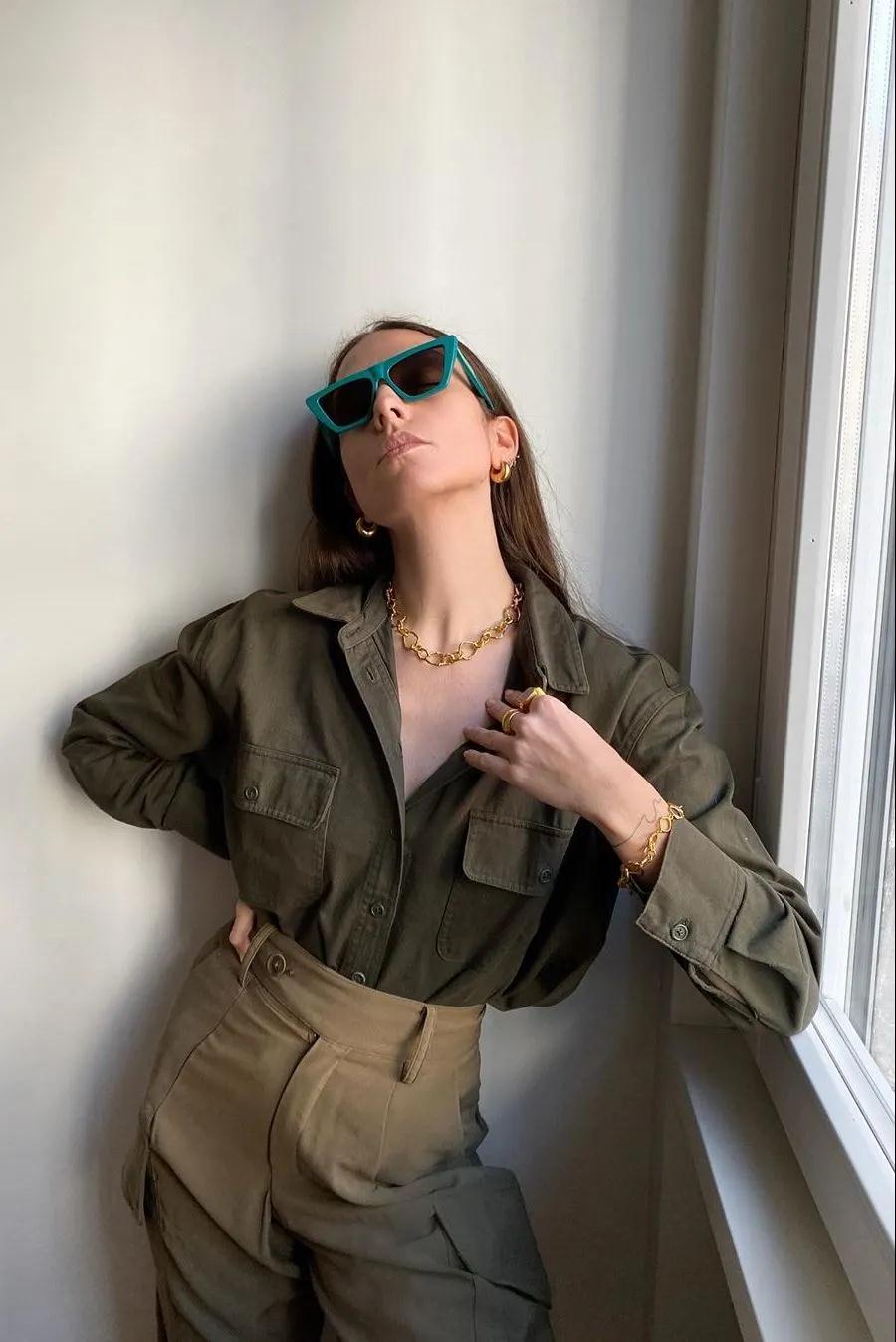如果你有许多长短不一的金色项链,可以试着将它们叠戴。锁骨够漂亮的,可以敞开戴,有给锁骨加“高光”作用。